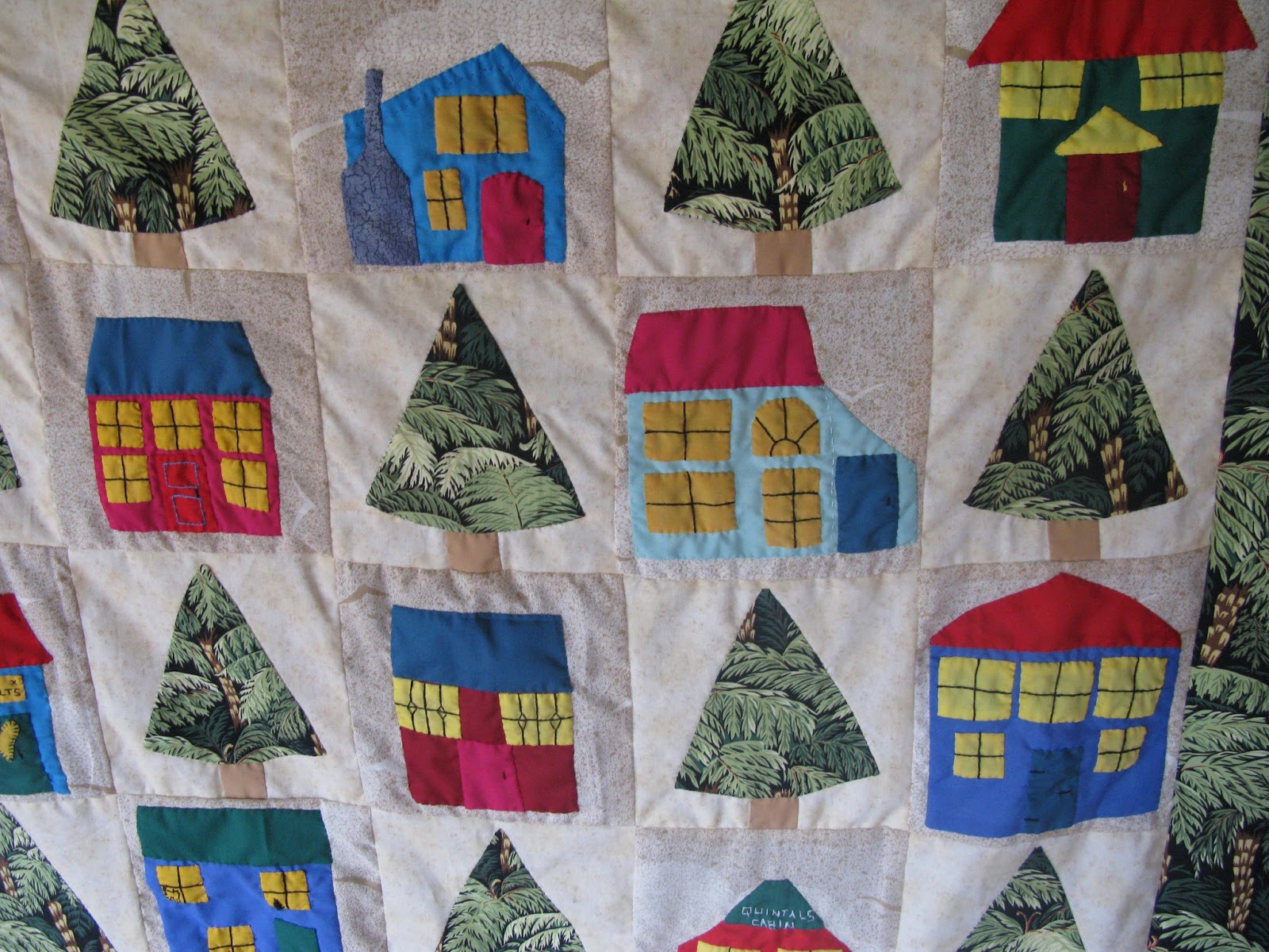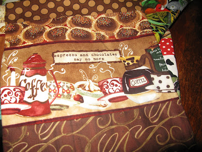The central square is a map of Australia showing St George in Queensland where Annette and her friend Helen lived. I was able to help out by running this off on my printer, along with a label for the back. She named the quilt "No Valleys in St. George". Pine trees appropriately surround the map.I am so glad I was able to see the quilt before Annette left. The brought it round home to show me the night before...it only needed a few more stitches on the binding.